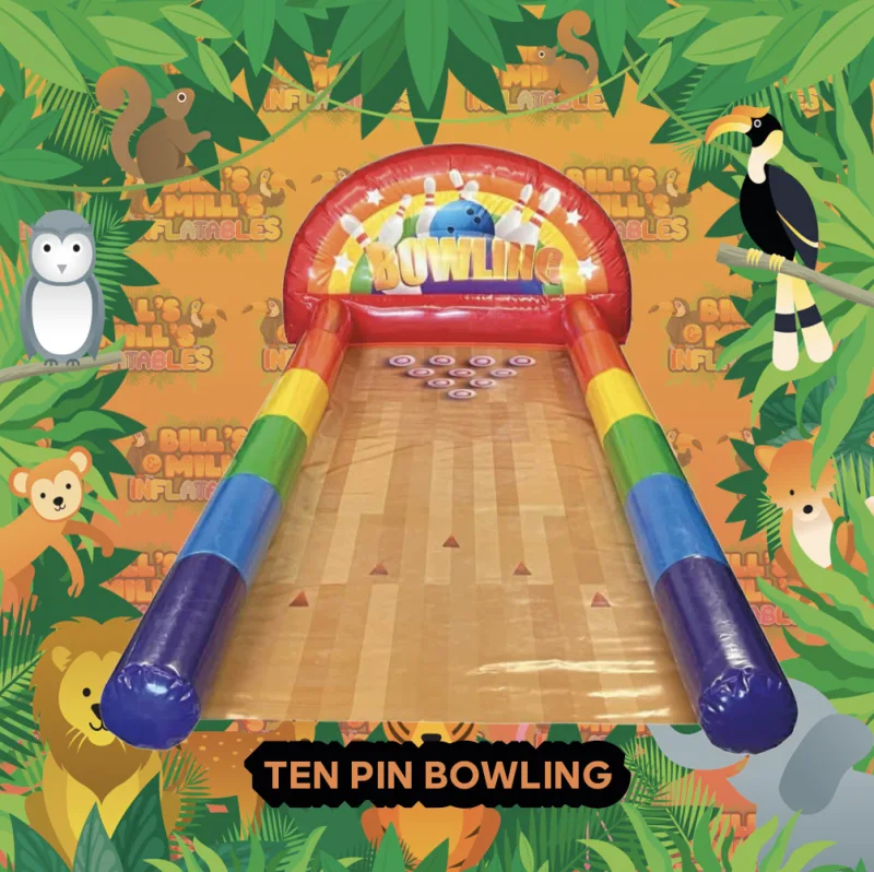 Experience the excitement of the alley with our Ten Pin Bowling set, available for hire from Bills and Mills Inflatables! Perfect for all ages and skill levels, this inflatable bowling game brings the fun of bowling right to your event.
